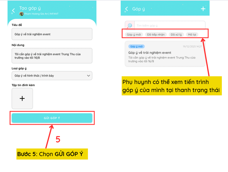 Phụ huynh có thể xem tiến trình góp ý của mình tại thanh trạng thái như trong hình