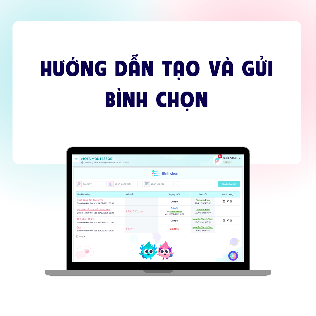 [Web] – Hướng dẫn tạo và gửi bình chọn Quyền thao tác: Admin; Giáo Viên Lưu ý: Tính năng bình chọn được cấu hình tùy theo nhu cầu sử dụng của từng trường, Admin vui lòng liên hệ đội ngũ hỗ trợ TOMIA để được hướng dẫn chi tiết. Để tạo và gửi bình chọn, Admin và giáo viên có