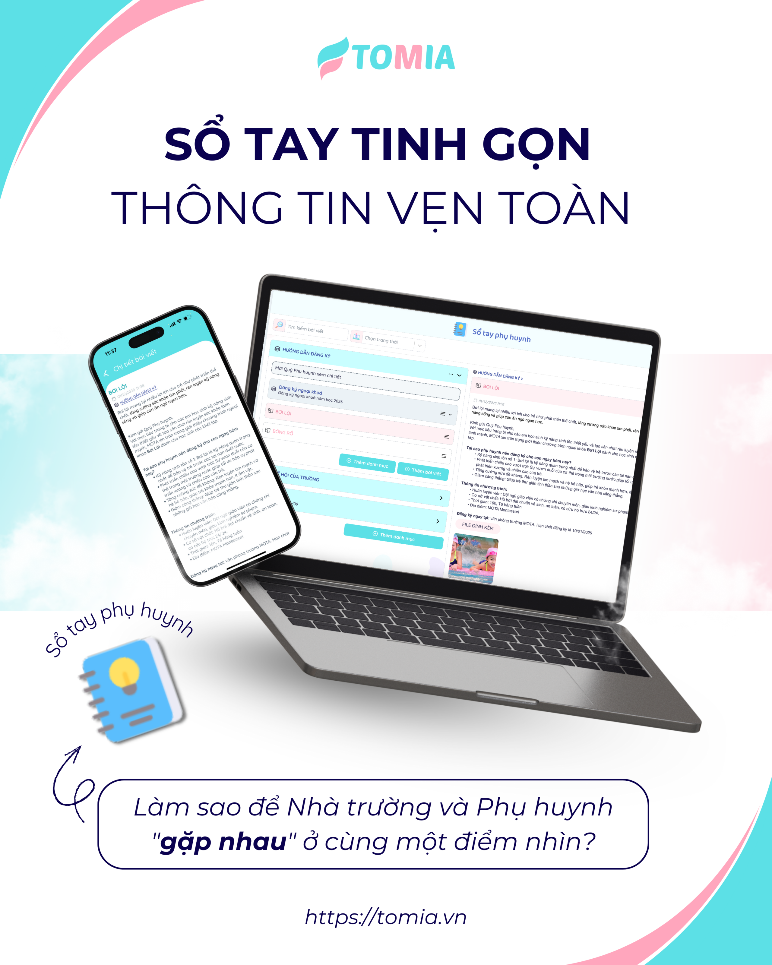 📘 Làm sao để Nhà trường và Phụ huynh “gặp nhau” ở cùng một điểm nhìn? Câu trả lời nằm ngay tại Sổ tay phụ huynh của TOMIA. Nhà trường có thể quy tụ mọi nội dung quan trọng về một “không gian” duy nhất – minh bạch, chỉn chu và dễ tiếp cận. 🏫