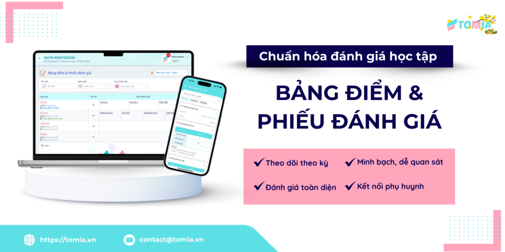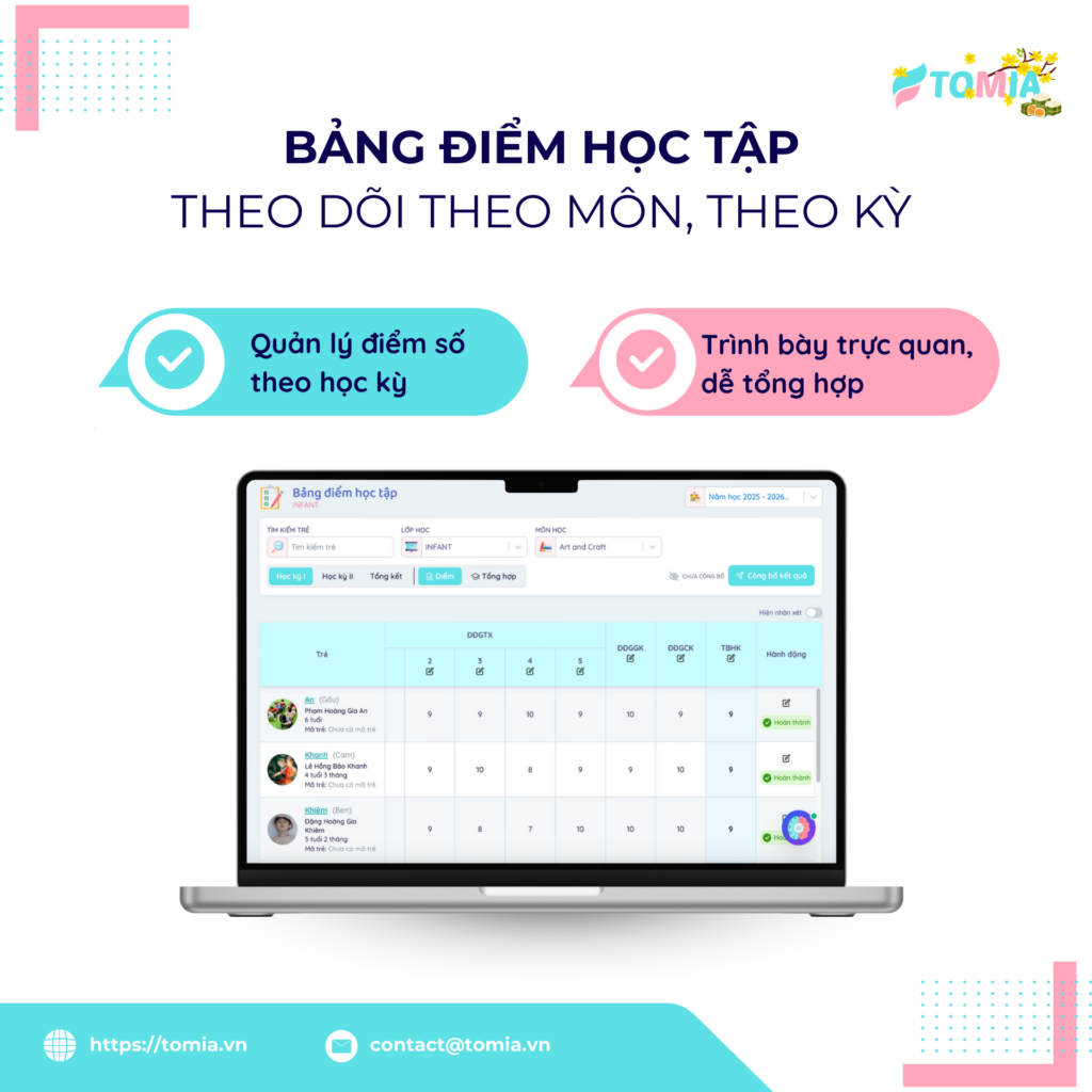 Hiểu điều đó, TOMIA chính thức ra mắt tính năng Bảng điểm & Phiếu đánh giá học tập, giúp việc đánh giá không còn là thông tin đến cuối năm, mà trở thành dữ liệu minh bạch, theo dõi được theo từng kỳ học.