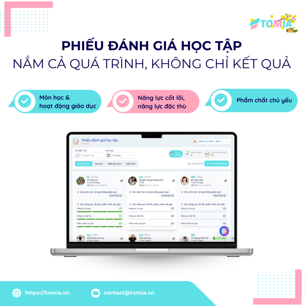 TOMIA hỗ trợ nhà trường chuẩn hóa công tác đánh giá, giảm áp lực tổng hợp cho giáo viên và tăng sự minh bạch trong kết nối với phụ huynh.