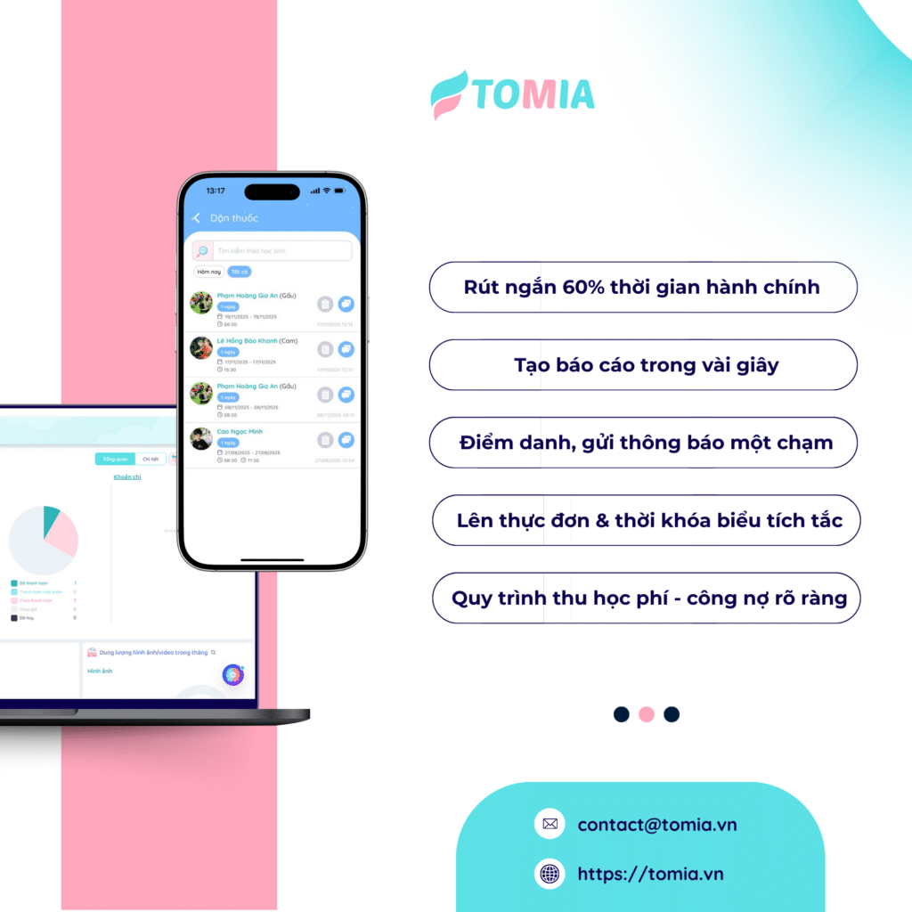 TOMIA - Phần mềm quản lý AI hiện đại cho trường học - Giải pháp hàng đầu trong công tác trao đổi thông tin đa chiều giữa nhà trường, giáo viên và phụ huynh; tiết kiệm thời gian và công sức nhờ vào sổ liên lạc điện tử, giáo án chi tiết và cập nhật thông tin nhanh chóng. Liên hệ ngay với TOMIA để trải nghiệm nhé!