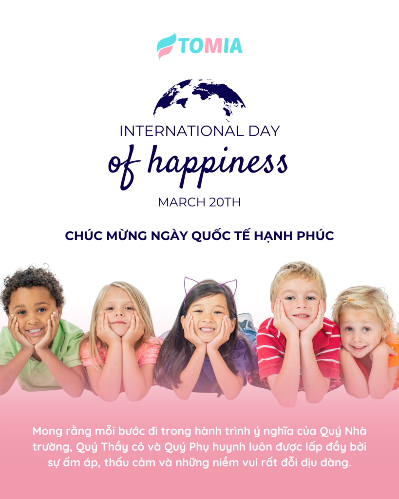 Nhân ngày Quốc tế Hạnh phúc, TOMIA xin gửi lời chúc chân thành đến Quý Nhà trường, Quý Thầy cô và Quý Phụ huynh, mong rằng mỗi bước đi trong hành trình ý nghĩa ấy luôn được lấp đầy bởi sự ấm áp, thấu cảm và những niềm vui rất đỗi dịu dàng.