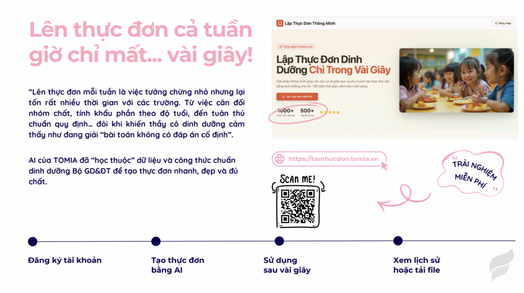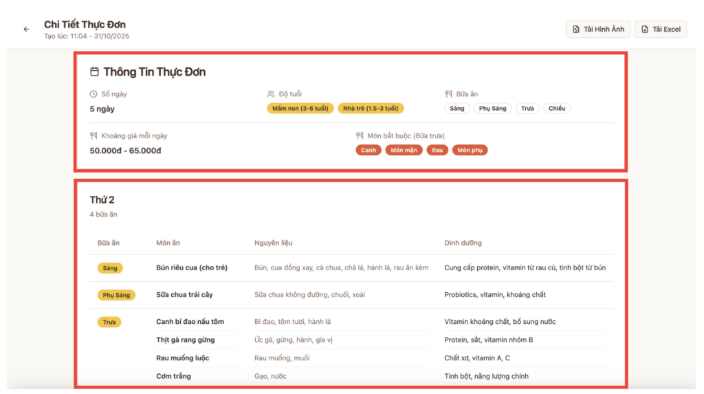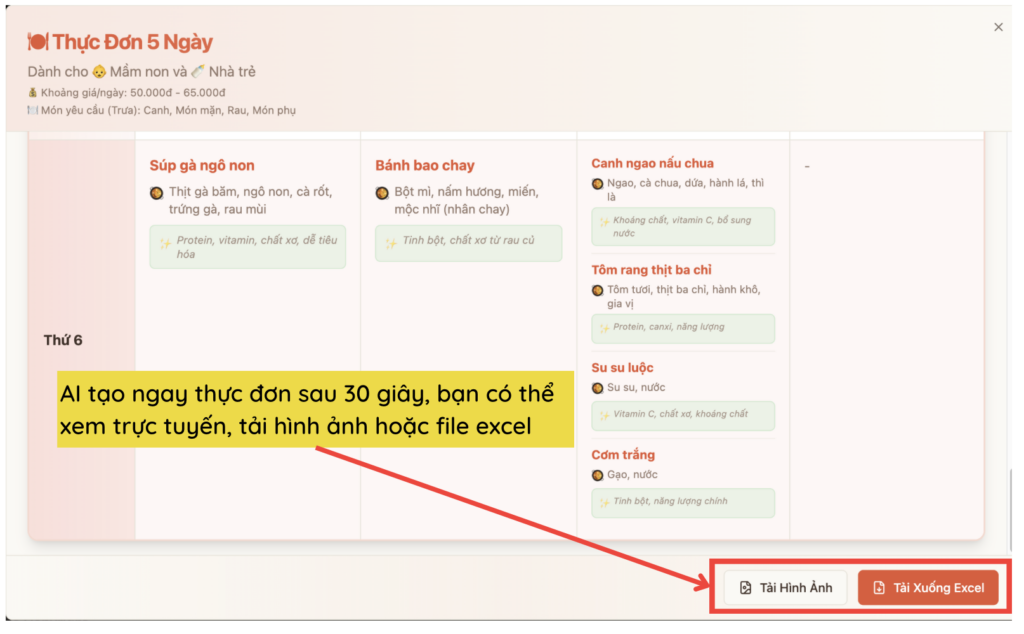 AI tạo ngay thực đơn sau 30 giây, giáo viên có thể xem trực tuyến, tải hình ảnh hoặc file excel