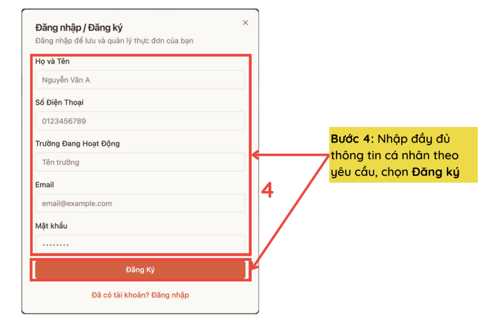 Bước 4: Nhập đầy đủ thông tin cá nhân theo yêu cầu, chọn Đăng ký
