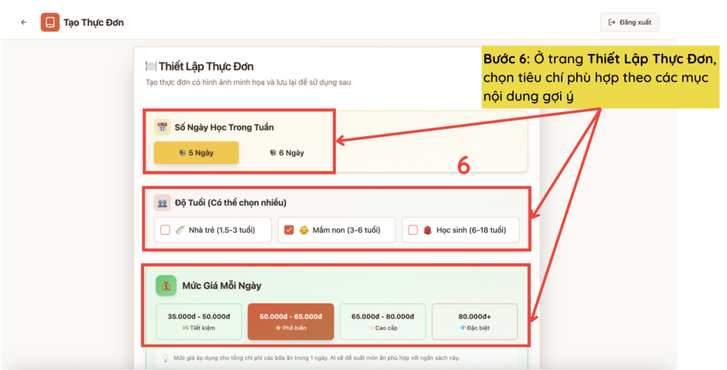 Bước 6: Ở trang Thiết Lập Thực Đơn, chọn tiêu chí phù hợp theo các mục nội dung gợi ý
