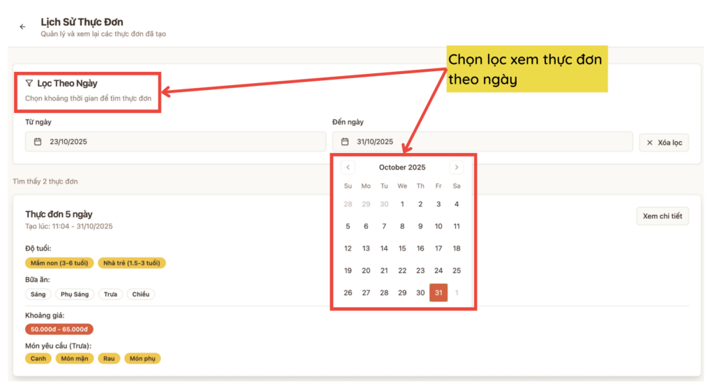 Chọn lọc xem thực đơn theo ngày