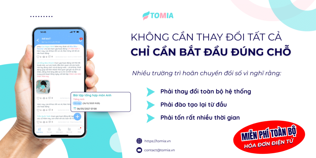 TOMIA - Tiên phong AI vì giáo dục nhân văn - Giải pháp hàng đầu trong công tác trao đổi thông tin đa chiều giữa nhà trường, giáo viên và phụ huynh; tiết kiệm thời gian và công sức nhờ vào sổ liên lạc điện tử, giáo án chi tiết và cập nhật thông tin nhanh chóng. Liên hệ ngay với TOMIA để trải nghiệm nhé!