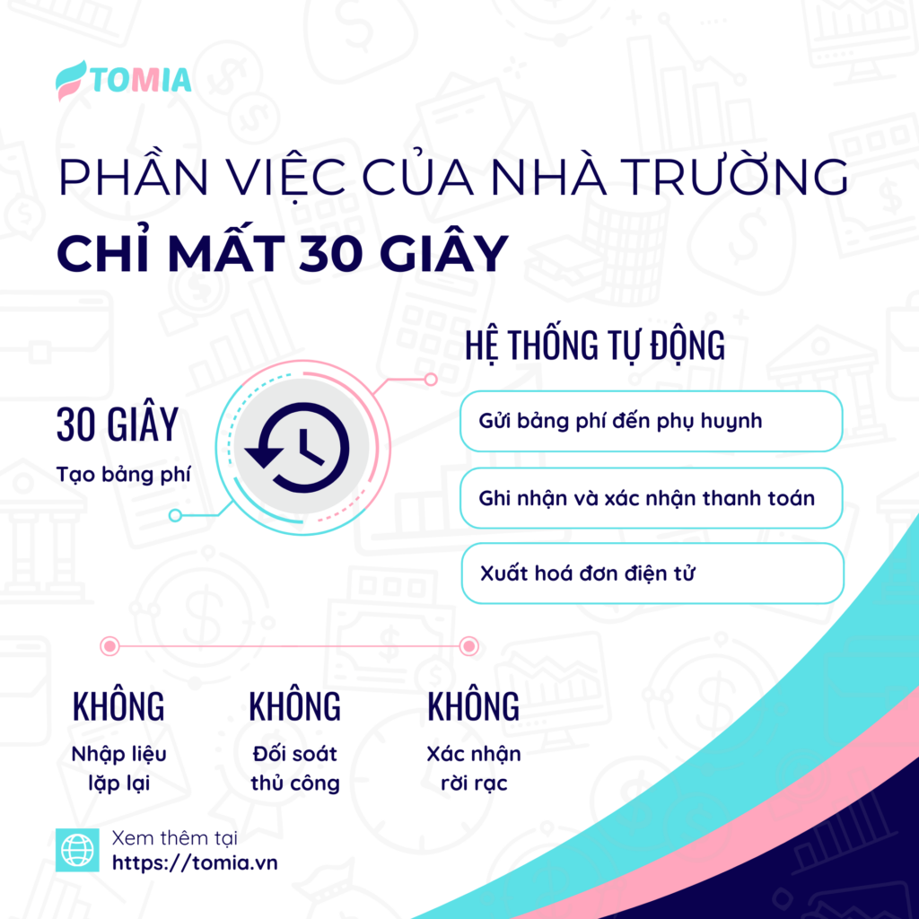 Toàn bộ quy trình thu học phí chỉ gói gọn trong 1 BƯỚC DUY NHẤT, với tiêu chí TỰ ĐỘNG – NHANH CHÓNG – CHÍNH XÁC, đây là cách TOMIA chọn đồng hành lâu dài cùng Quý Nhà trường, để không còn những câu hỏi quen thuộc mỗi kỳ thu phí: