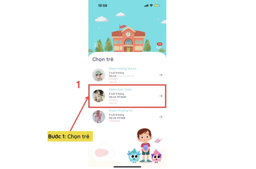 Bước 1: Chọn trẻ cần quan sát tiến độ