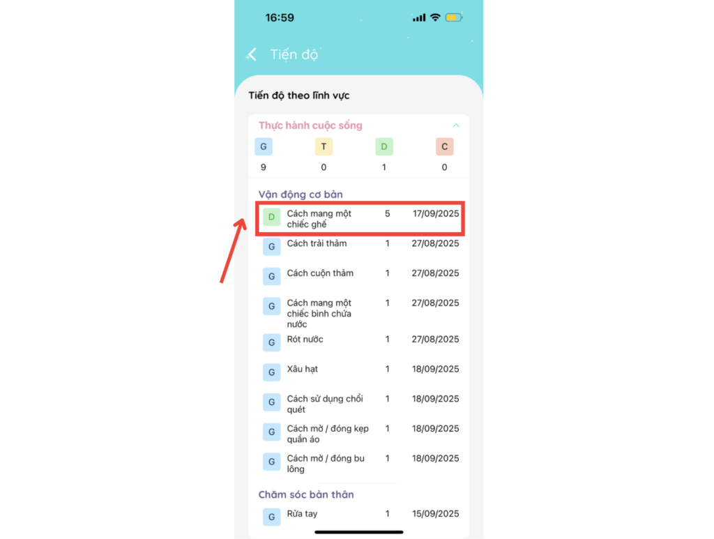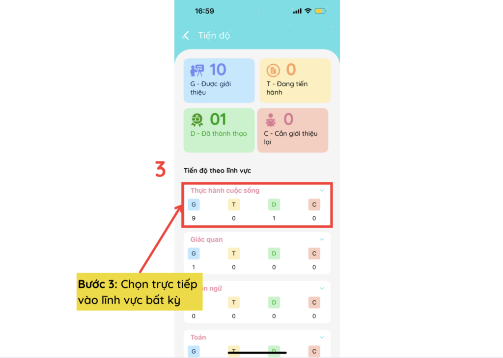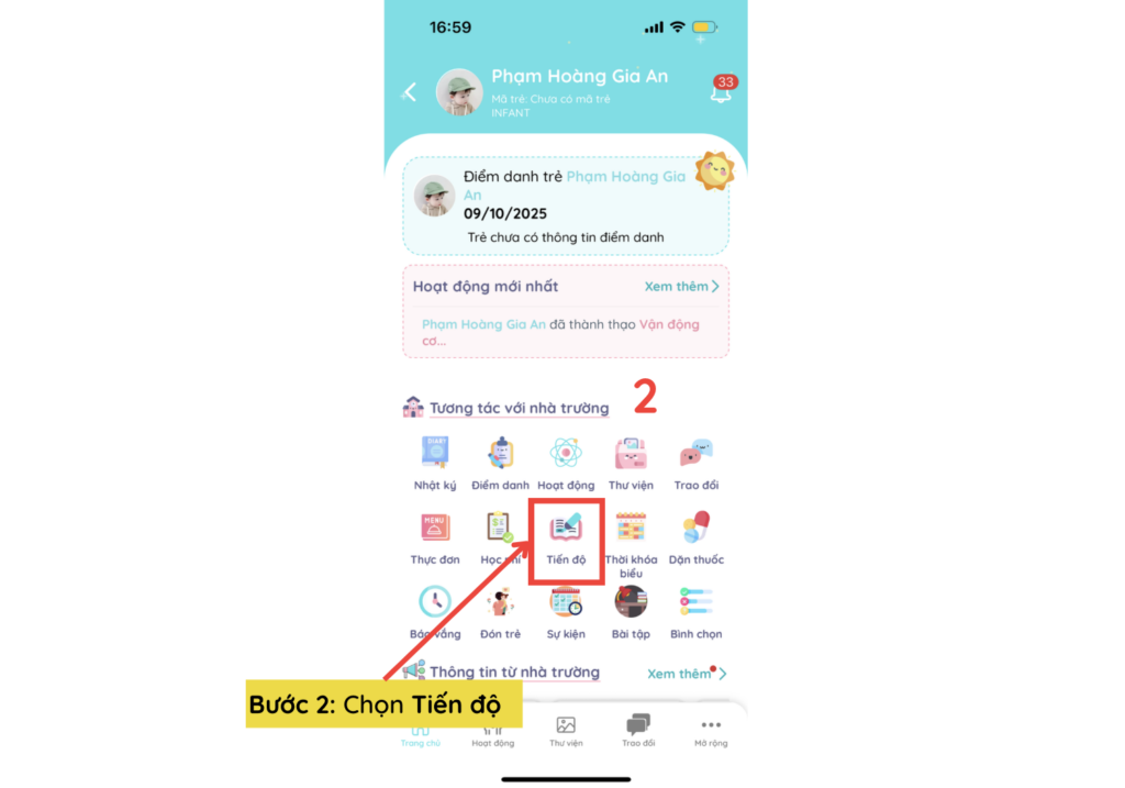 Để xem cụ thể chi tiết tiến độ của trẻ, phụ huynh thực hiện theo thao tác dưới đây: