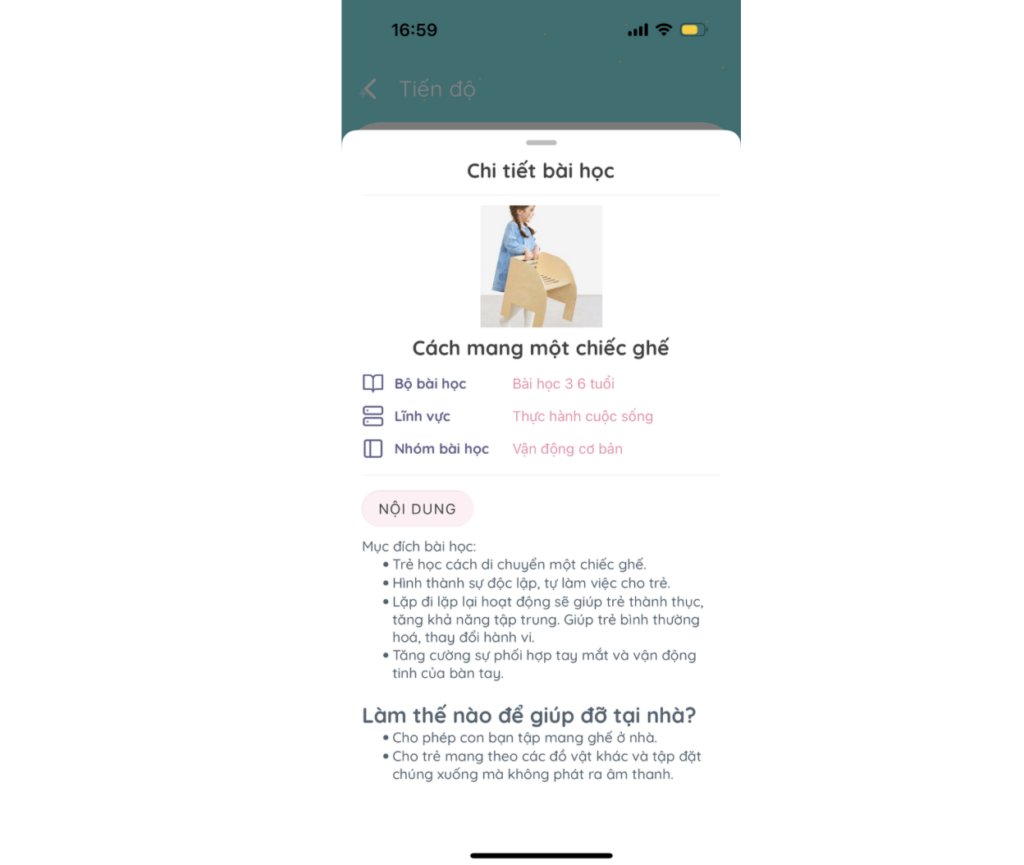 Sau khi chọn vào lĩnh vực thì thông tin chi tiết của bài học mà trẻ đã thực hành trên lớp sẽ được hiển thị, liệt kê ra.