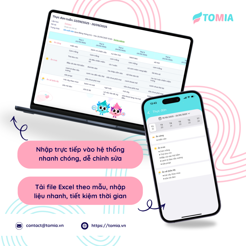 Mọi thực đơn đều có thể hiển thị trực quan, chia sẻ tức thì cho phụ huynh và giáo viên, giúp việc phối hợp giữa nhà bếp – văn phòng – lớp học trở nên trơn tru và chuyên nghiệp hơn bao giờ hết.