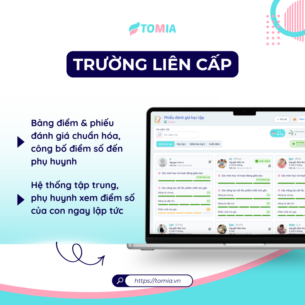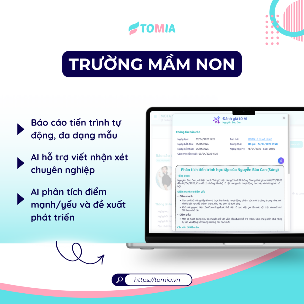 TOMIA - Tiên phong AI vì giáo dục nhân văn - Giải pháp hàng đầu trong công tác trao đổi thông tin đa chiều giữa nhà trường, giáo viên và phụ huynh; tiết kiệm thời gian và công sức nhờ vào sổ liên lạc điện tử, giáo án chi tiết và cập nhật thông tin nhanh chóng. Liên hệ ngay với TOMIA để trải nghiệm nhé!