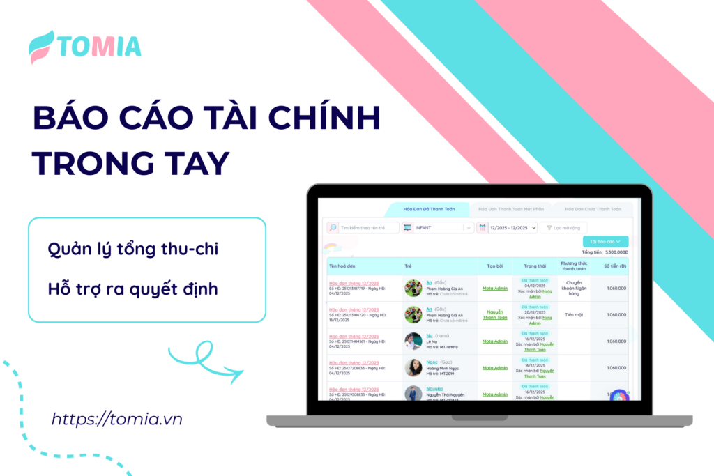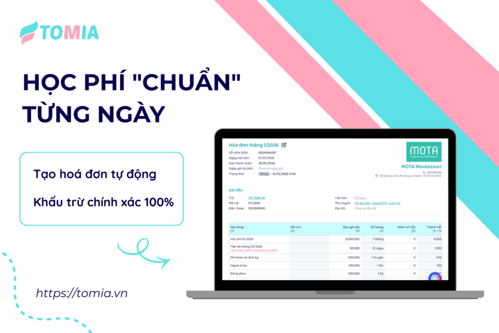 ✅ Học phí “chuẩn” từng ngày: Hoá đơn được tính tự động dựa trên dữ liệu điểm danh thực tế. Nghỉ có phép, không phép, tiền ăn… đều được khấu trừ chính xác 100%.
