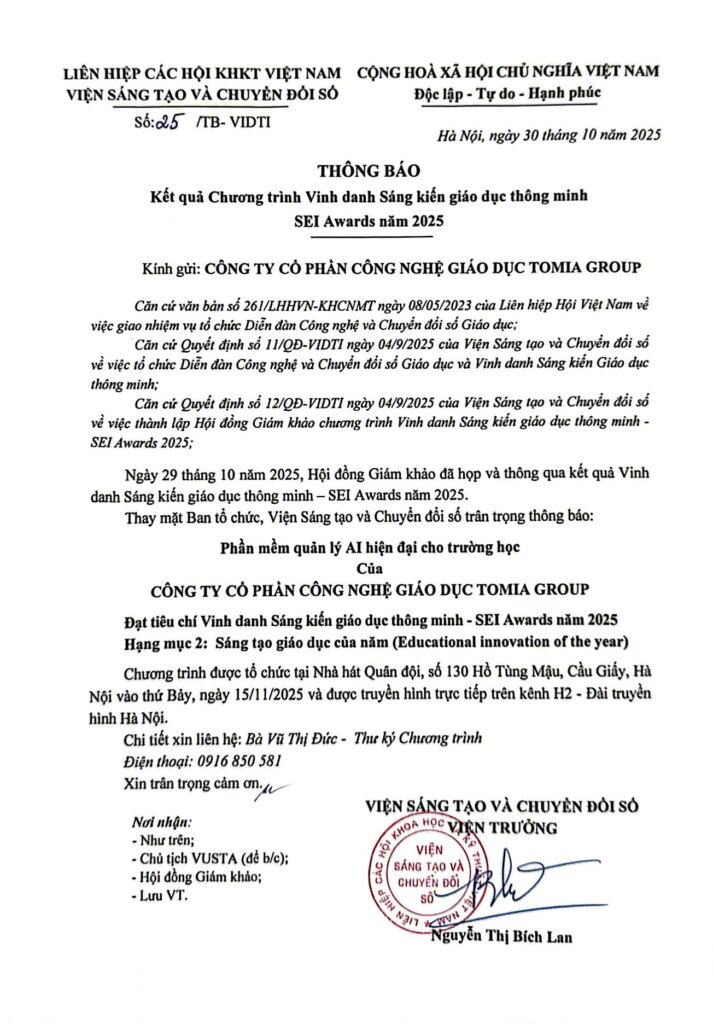 Hệ thống quản lý trường học bằng AI của TOMIA Group đã được Viện Sáng tạo & Chuyển đổi số vinh danh ở hạng mục “Sáng tạo giáo dục của năm” (Educational Innovation of the Year).