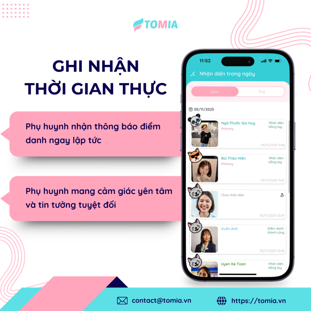 - Ghi nhận thời gian thực: Phụ huynh nhận thông báo điểm danh ngay lập tức, mang lại sự yên tâm và tin tưởng tuyệt đối.