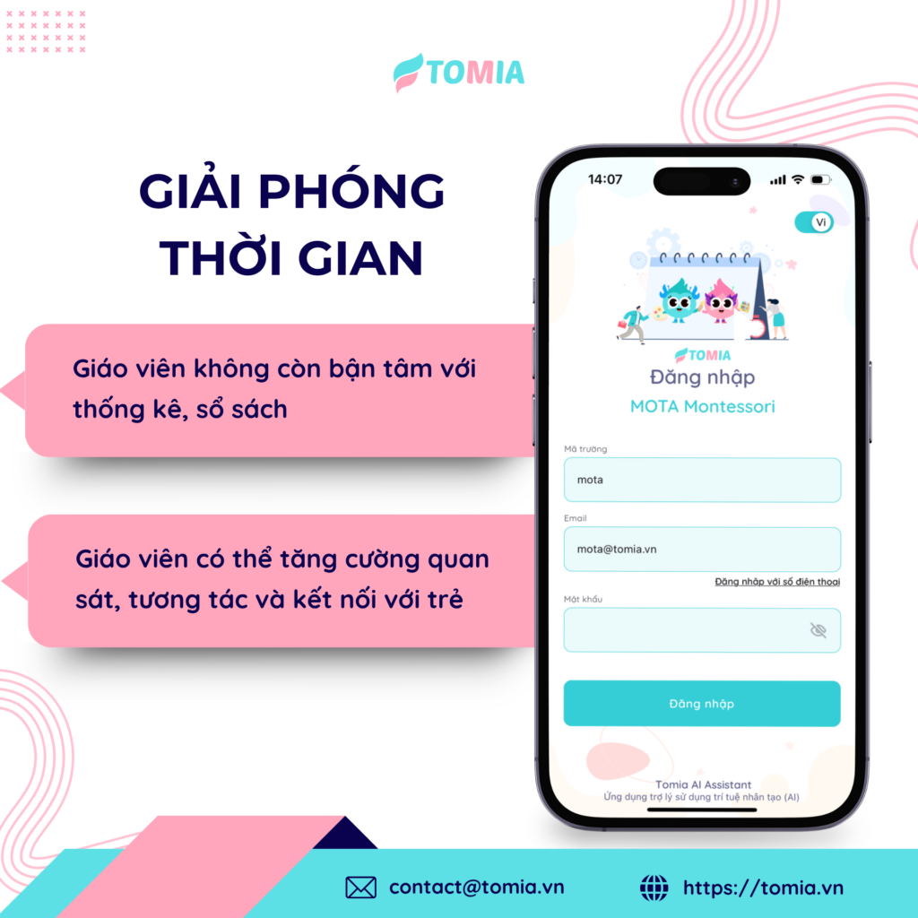 TOMIA - Phần mềm quản lý AI hiện đại cho trường học - Giải pháp hàng đầu trong công tác trao đổi thông tin đa chiều giữa nhà trường, giáo viên và phụ huynh; tiết kiệm thời gian và công sức nhờ vào sổ liên lạc điện tử, giáo án chi tiết và cập nhật thông tin nhanh chóng. Liên hệ ngay với TOMIA để trải nghiệm nhé!