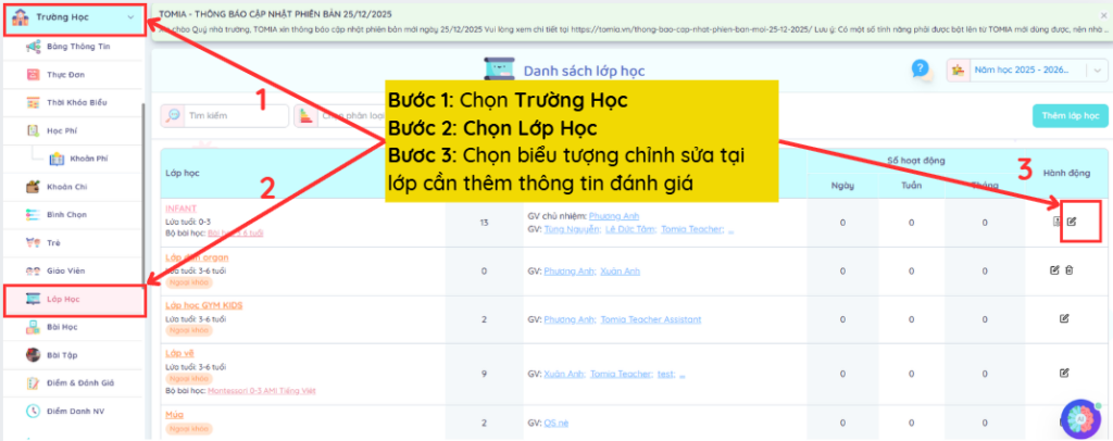 Bươc 3: Chọn biểu tượng chỉnh sửa tại lớp cần thêm thông tin đánh giá