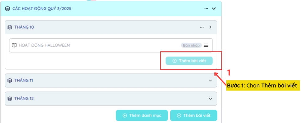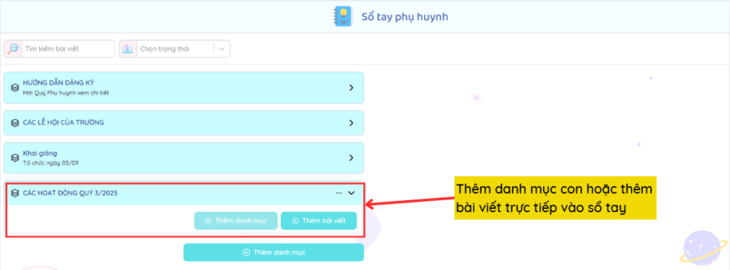 Sau khi hoàn tất tạo danh mục sổ tay phụ huynh, Admin vào danh mục đó để thêm danh mục con hoặc thêm bài viết vào sổ
