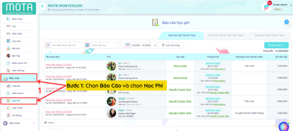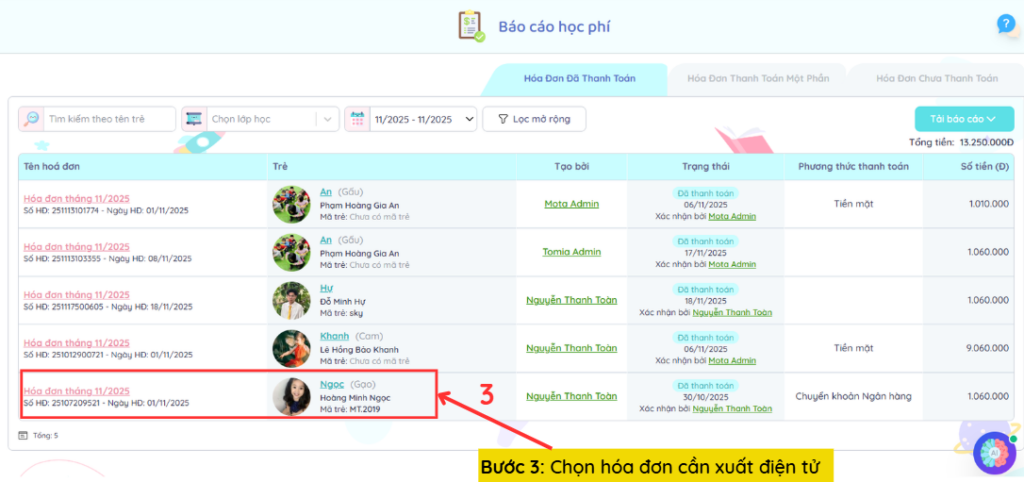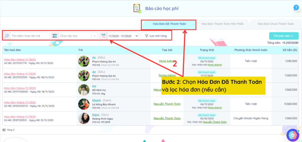 Bước 2: Chọn Hóa Đơn Đã Thanh Toán và lọc hóa đơn (nếu cần)