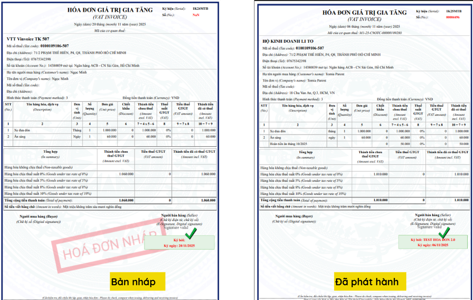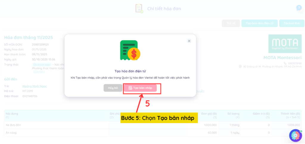 Lưu ý: Sau khi tạo bản nháp, nhà trường cần truy cập vào trang https://vinvoice.viettel.vn để phát hành hóa đơn vừa khởi tạo