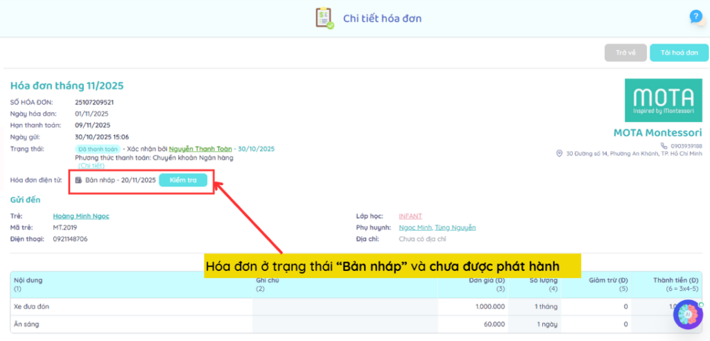- Hóa đơn ở trạng thái “Bản nháp”. Đối với trạng thái này, nhà trường có thể chọn nút Kiểm tra để xem lại hóa đơn nháp hoặc kiểm tra xem hóa đơn đã được phát hành hay chưa.