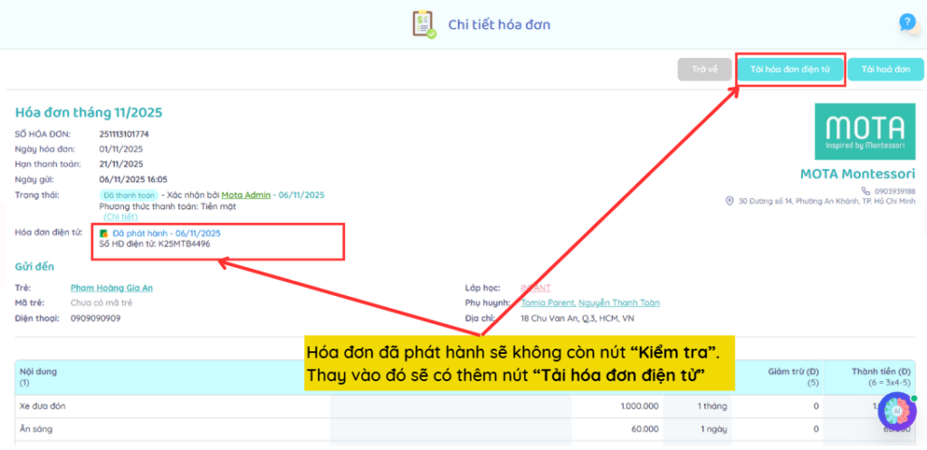 - Hóa đơn ở trạng thái “Đã phát hành”. Đối với trạng thái này, sẽ không còn nút “Kiểm tra”, thay vào đó nhà trường đã có thể tải hóa đơn điện tử.