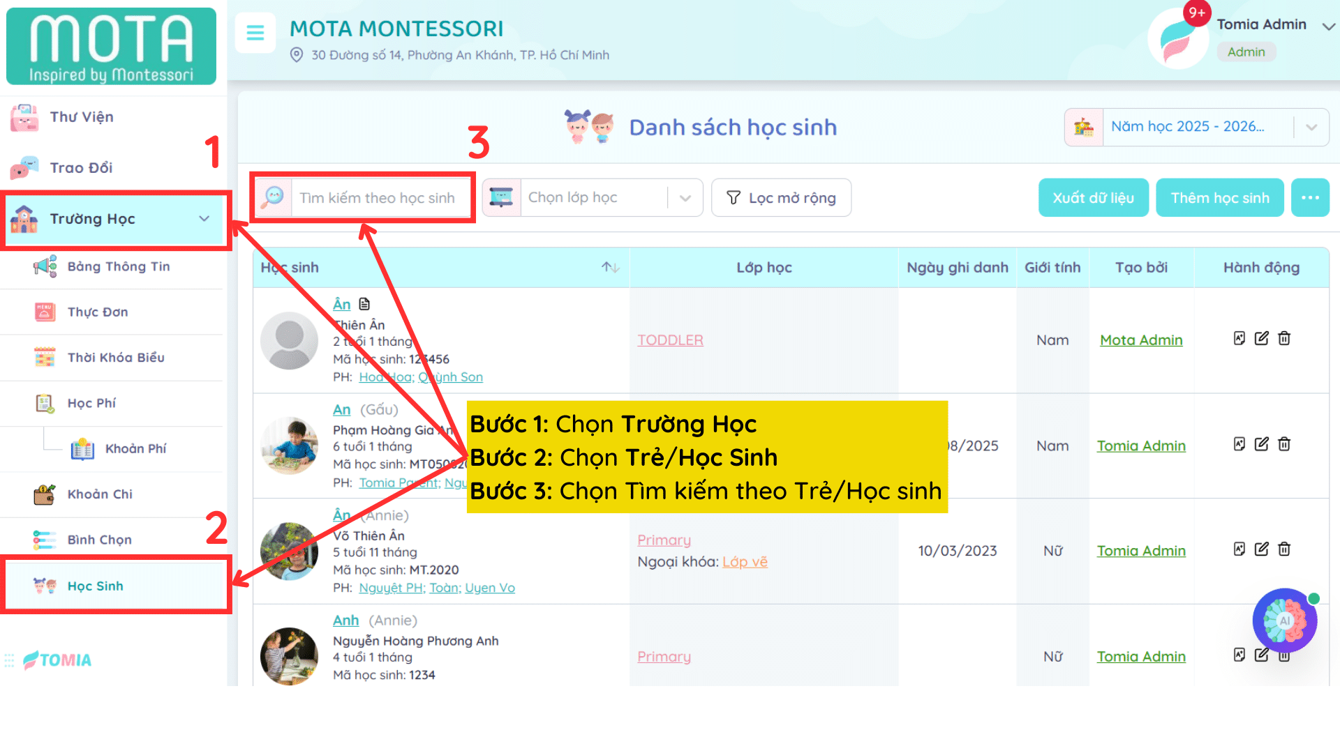 Bước 2: Chọn Trẻ/Học Sinh