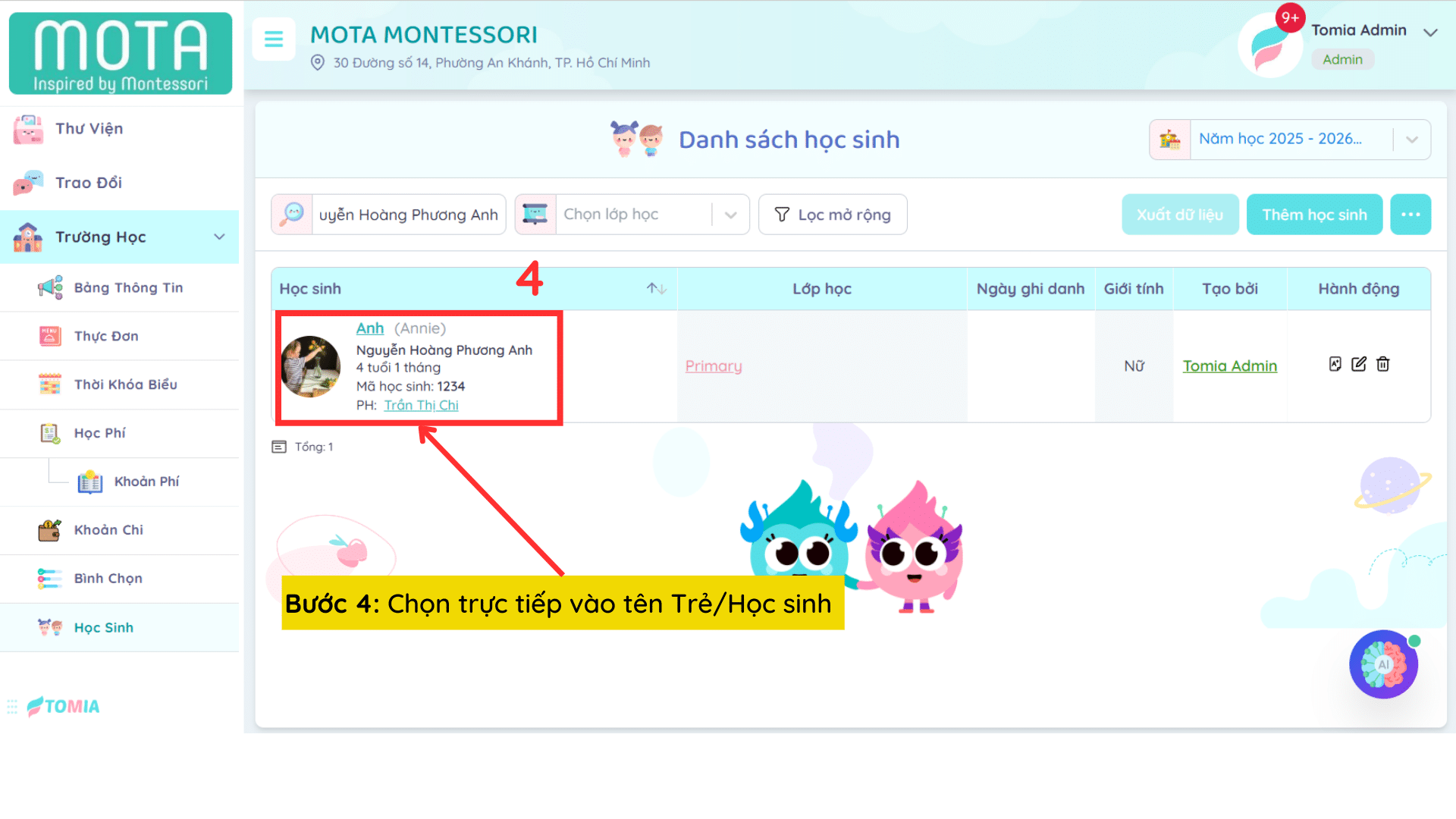 Bước 4: Chọn trực tiếp vào tên Trẻ/Học sinh cần thêm phụ huynh