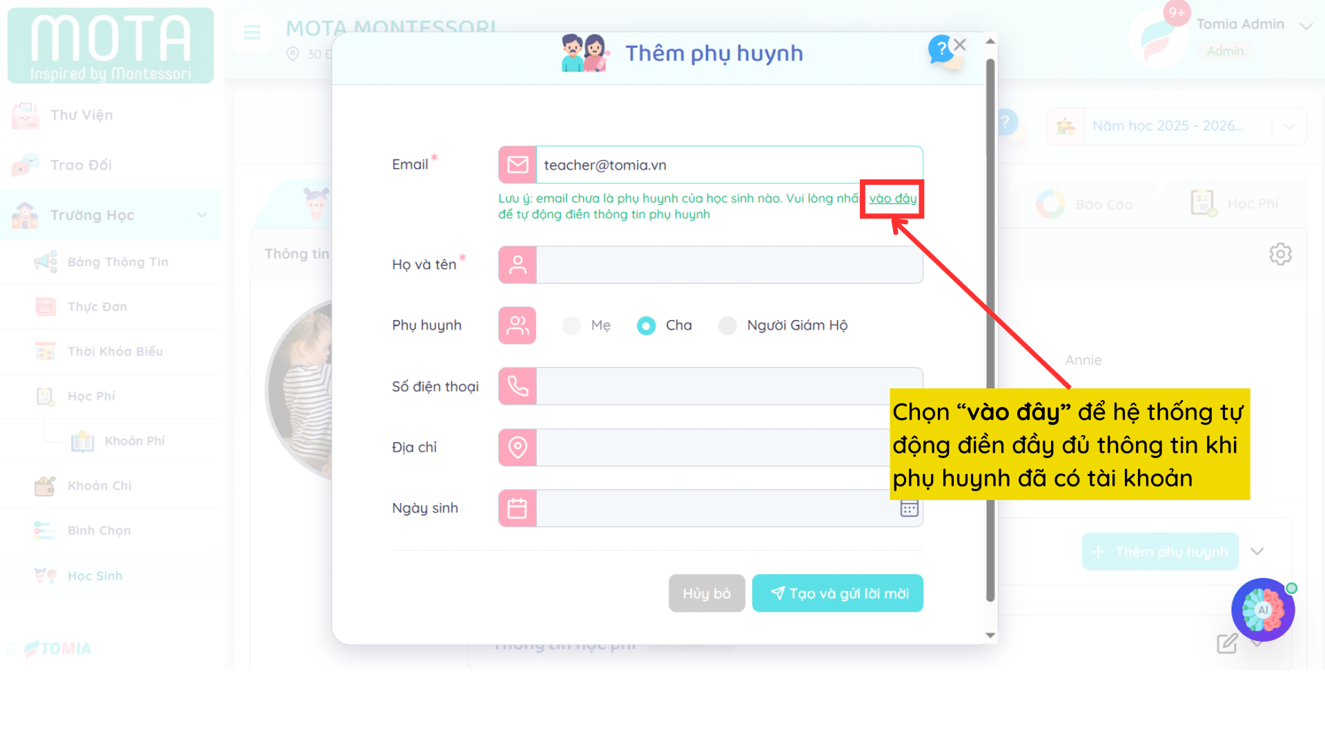 Lưu ý: Khi phụ huynh đã có tài khoản và con đang theo học tại trường, chọn “vào đây” để hệ thống tự động điền đầy đủ thông tin.