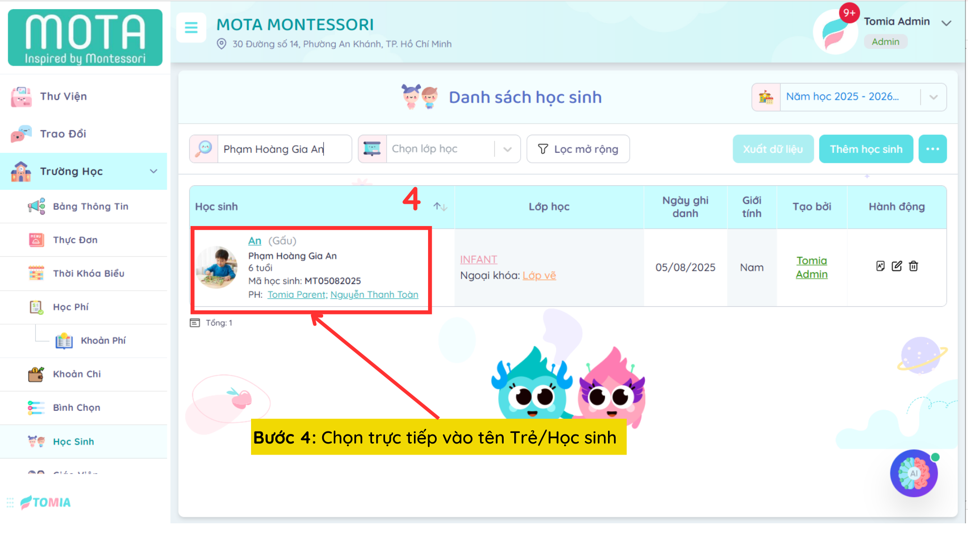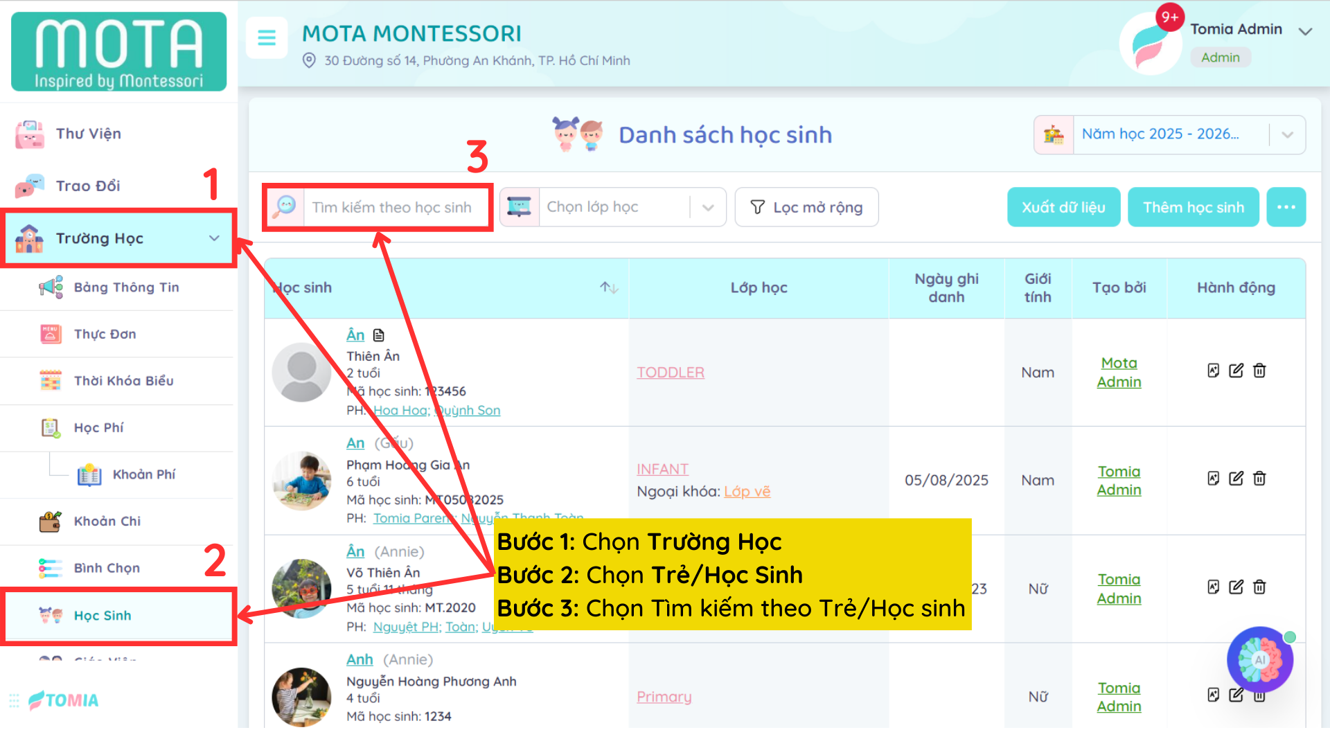 Bước 2: Chọn Trẻ/Học Sinh