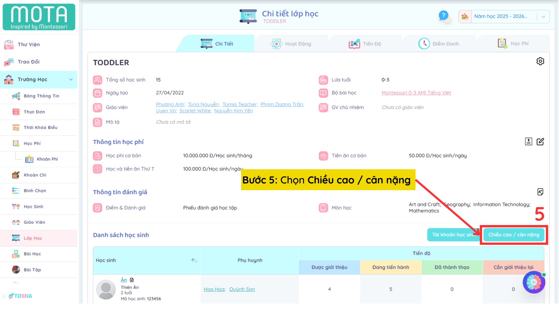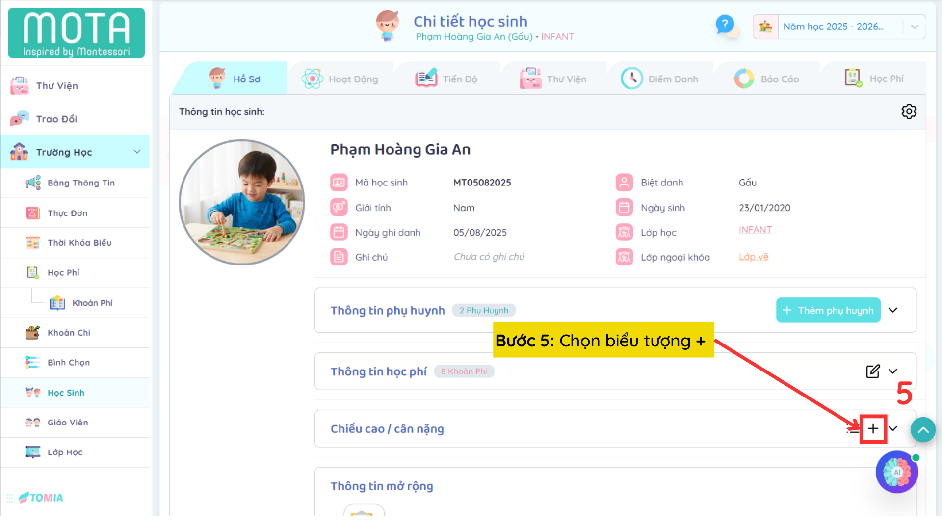 Bước 5: Chọn biểu tượng + tại Chiều cao / Cân nặng để THÊM chiều cao và cân nặng cho Trẻ/Học sinh