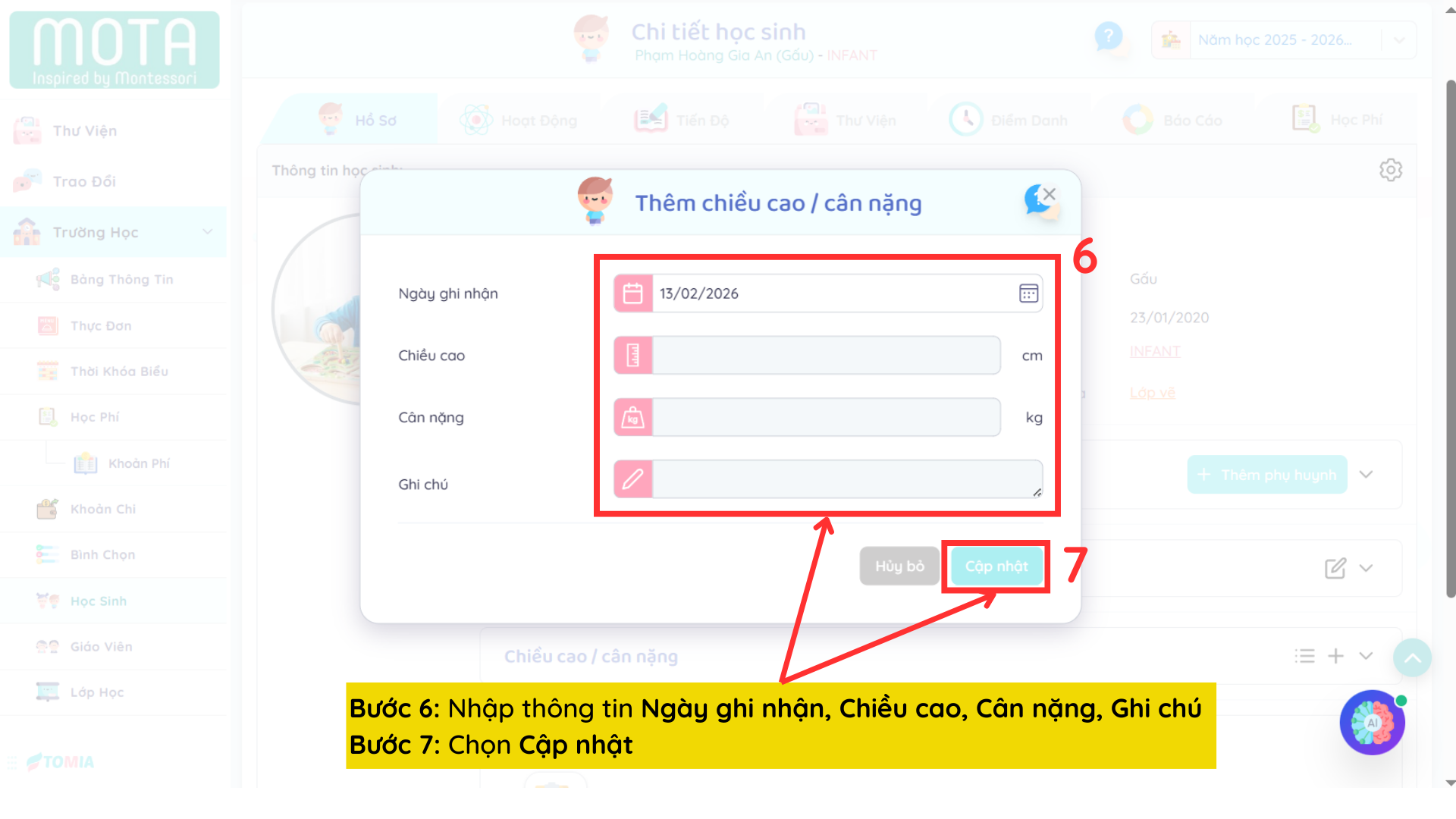 Bước 6: Nhập thông tin Ngày ghi nhận, Chiều cao, Cân nặng, Ghi chú của Trẻ/Học sinh
