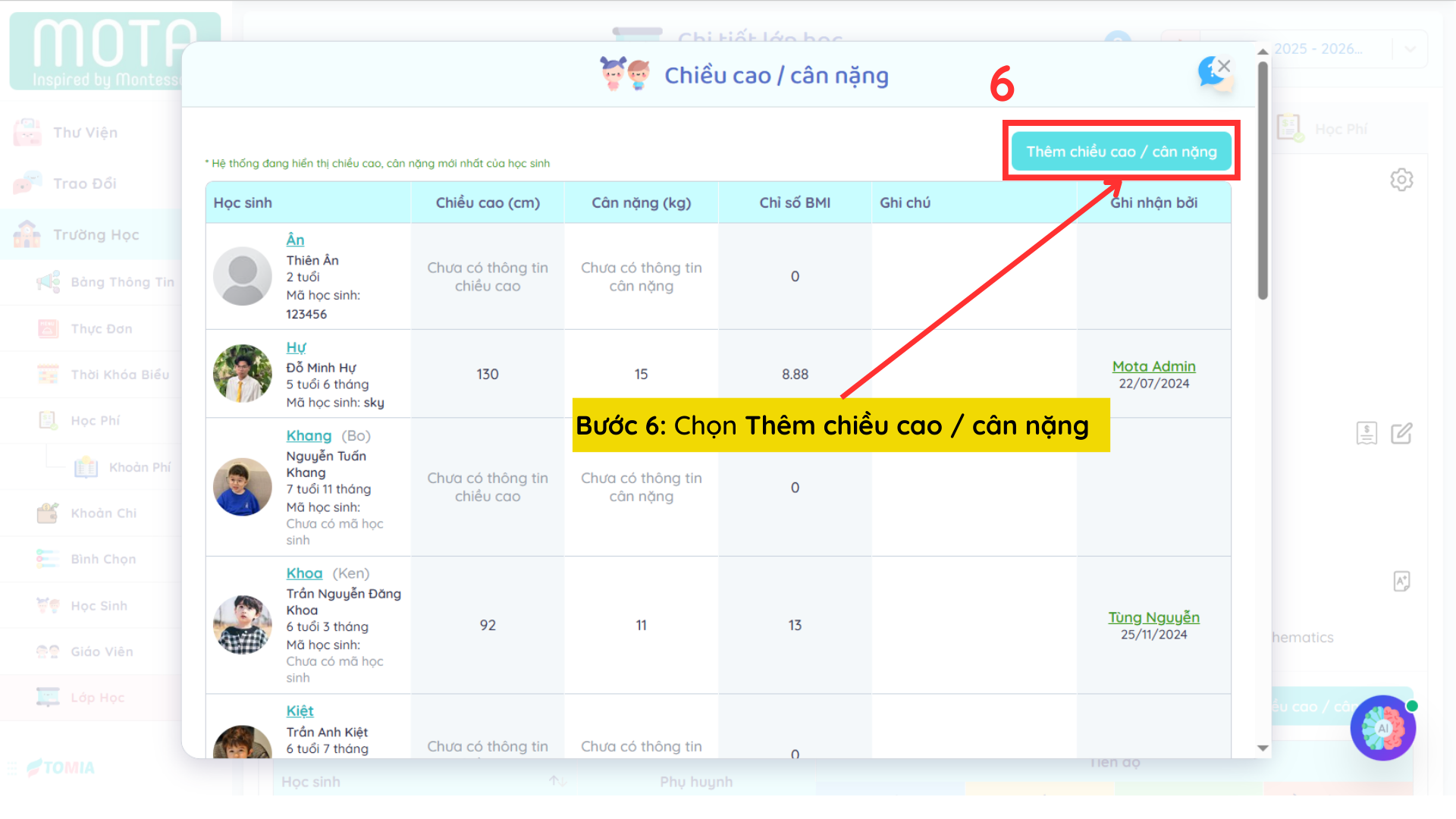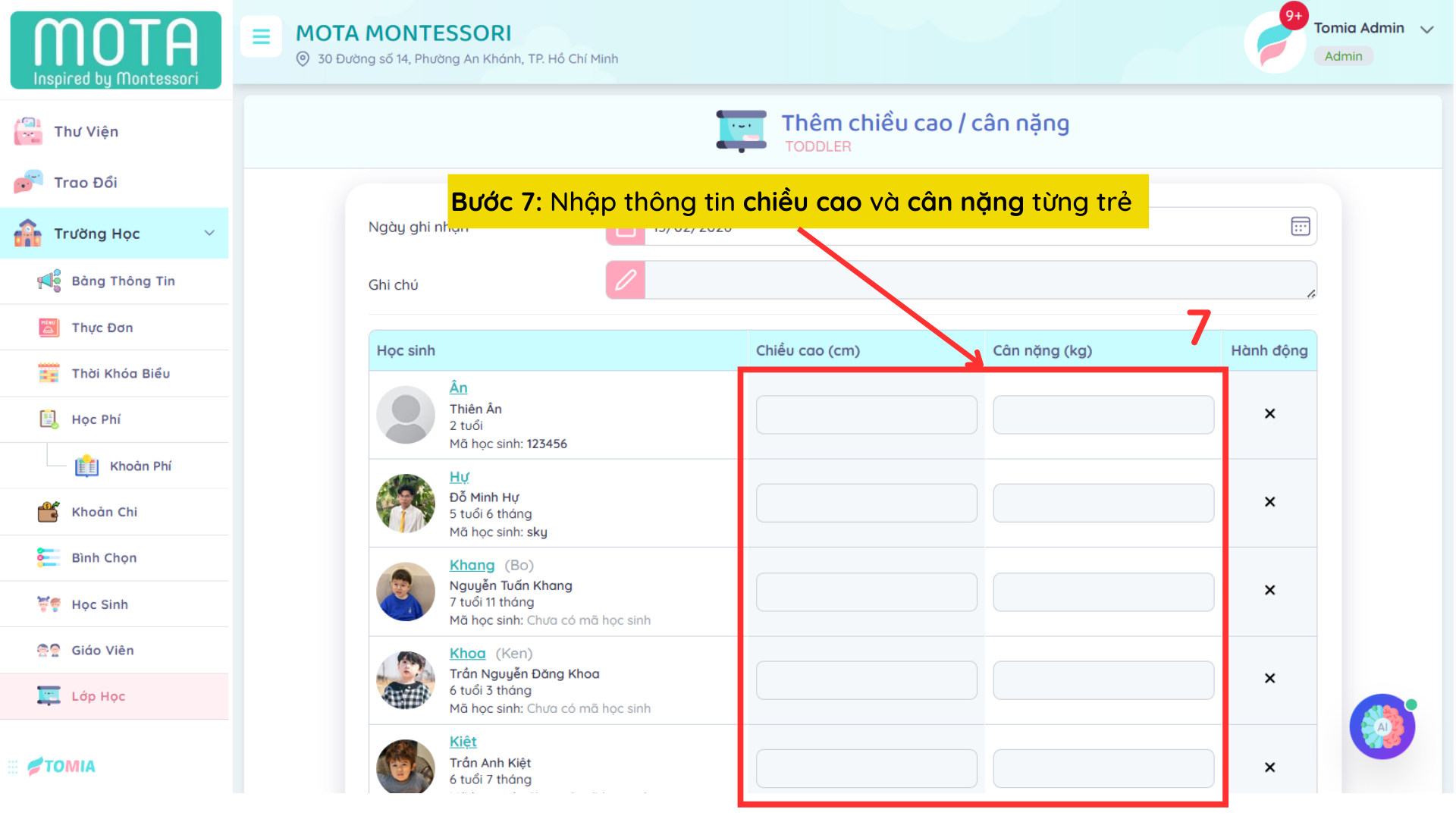 Bước 7: Nhập thông tin chiều cao và cân nặng từng trẻ