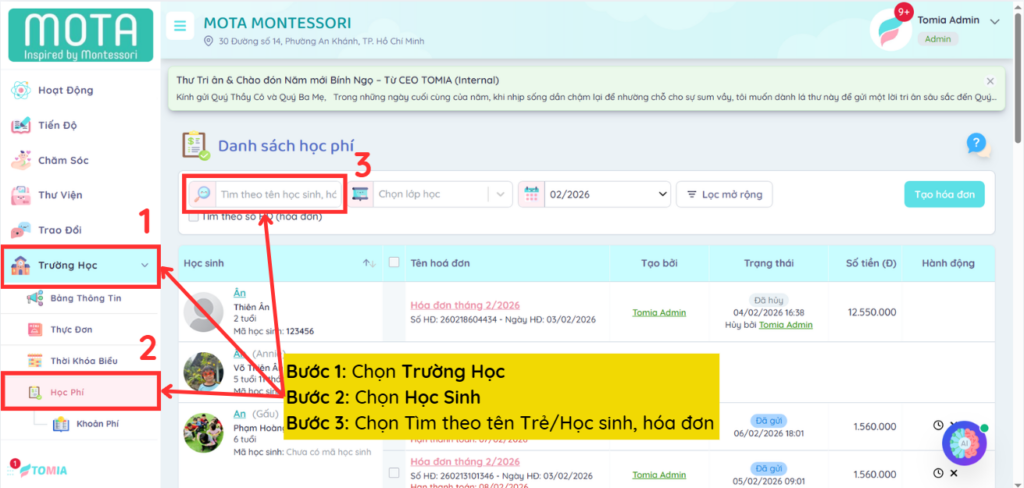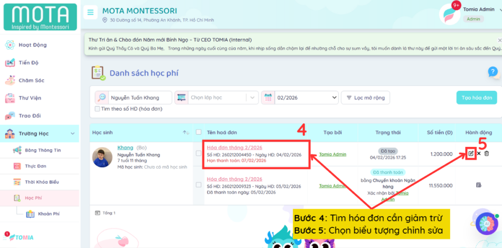Bước 3: Chọn Tìm theo tên Trẻ/Học sinh, hóa đơn cần giảm trừ