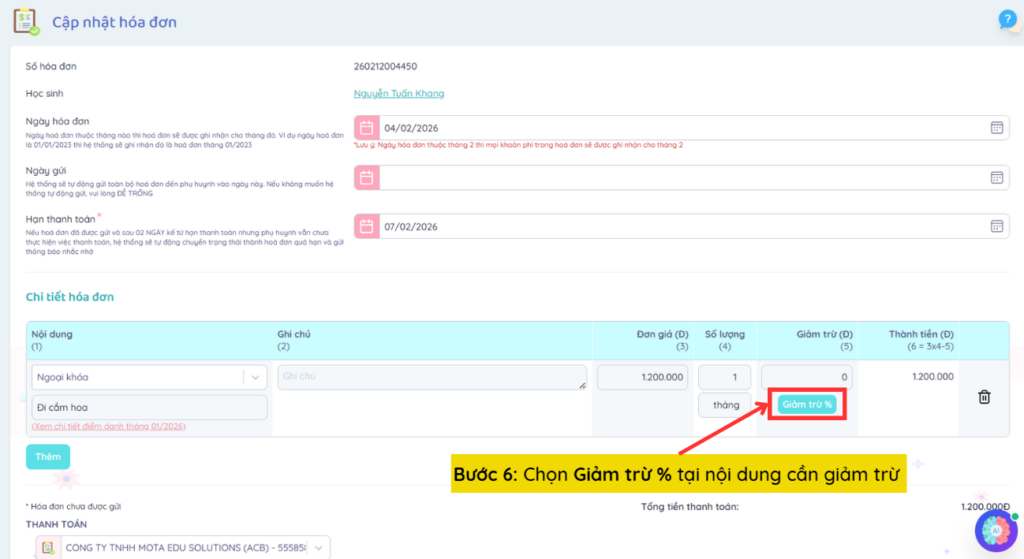 Bước 6: Tìm nội dung cần giảm trừ, sau đó chọn Giảm trừ % để điền số phần trăm hoặc nhập trực tiếp số tiền cần giảm trừ