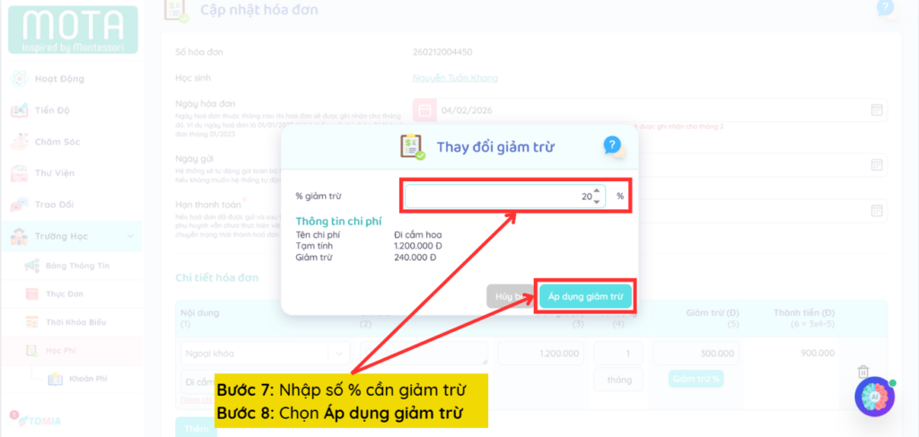 Ví dụ: Nhập 10% tương ứng giảm 500.000 đồng so với mức học phí là 5.000.000 đồng/tháng