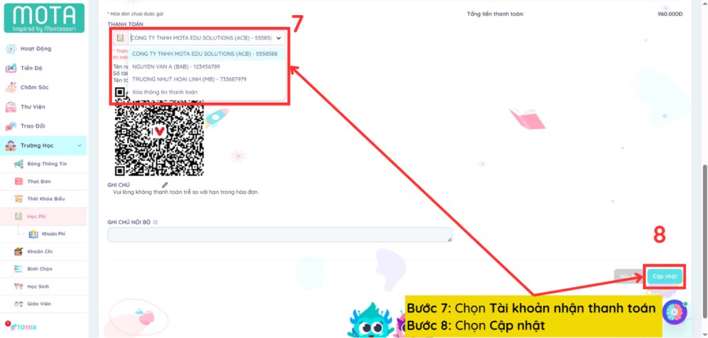 Bước 7: Chọn Tài khoản nhận thanh toán (thay đổi tài khoản nếu có)