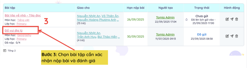 Bước 3: Chọn bài tập cần xác nhận nộp bài và đánh giá
