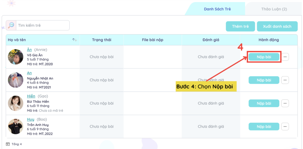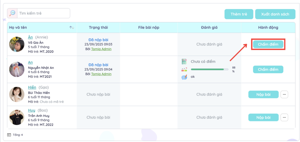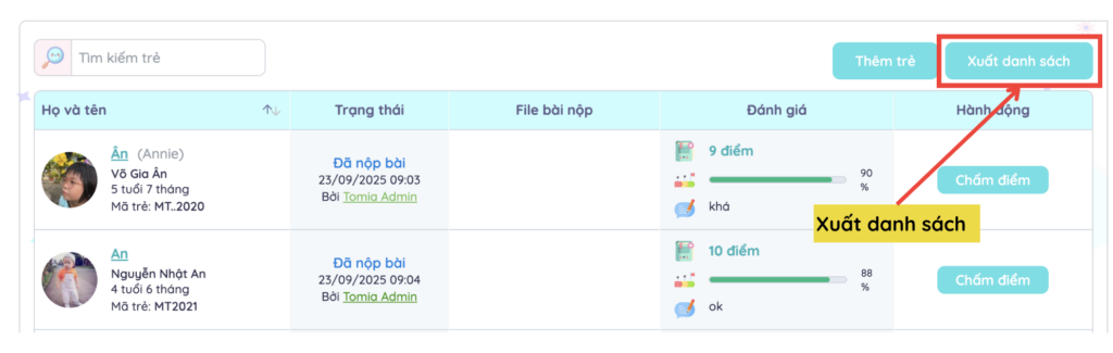 Để xác nhận nộp bài và chấm điểm cho từng trẻ, Admin và giáo viên có thể thực hiện các thao tác sau: