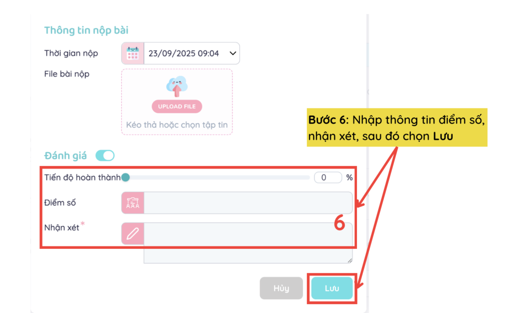 Bước 6: Nhập thông tin điểm số, nhận xét. Ngoài ra Admin và Giáo viên có thể thêm thời gian nộp bài, tải ảnh liên quan đến bài tập và đánh giá tiến độ hoàn thành nếu cần. Sau đó chọn LƯU để lưu thông tin.