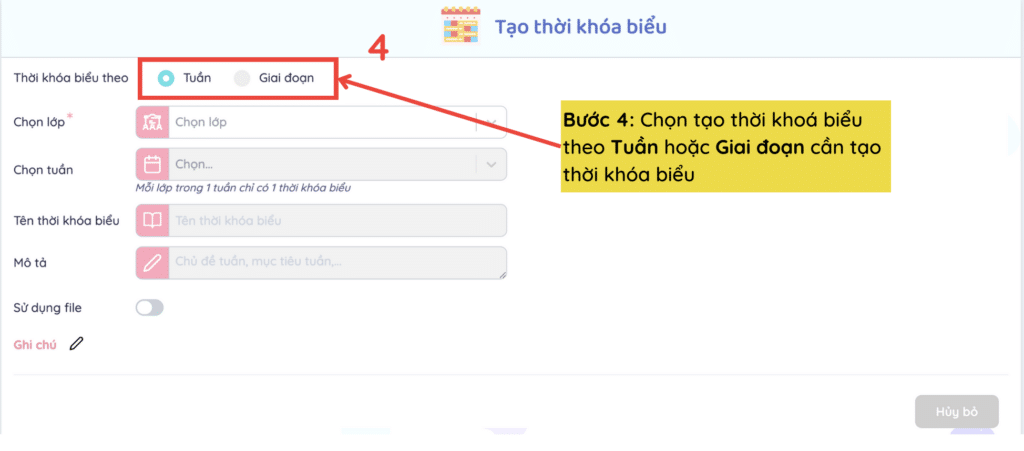 Bước 4: Chọn tạo thời khoá biểu theo Tuần hoặc Giai đoạn cần tạo thời khóa biểu