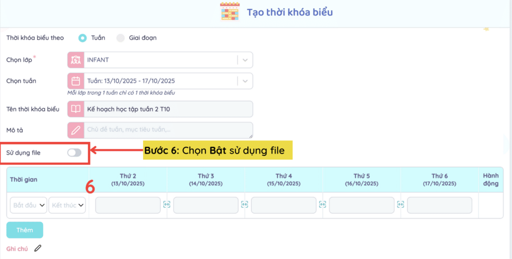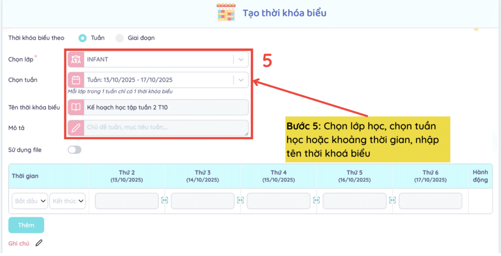 Bước 5: Chọn lớp học, chọn tuần học hoặc khoảng thời gian, nhập tên thời khoá biểu