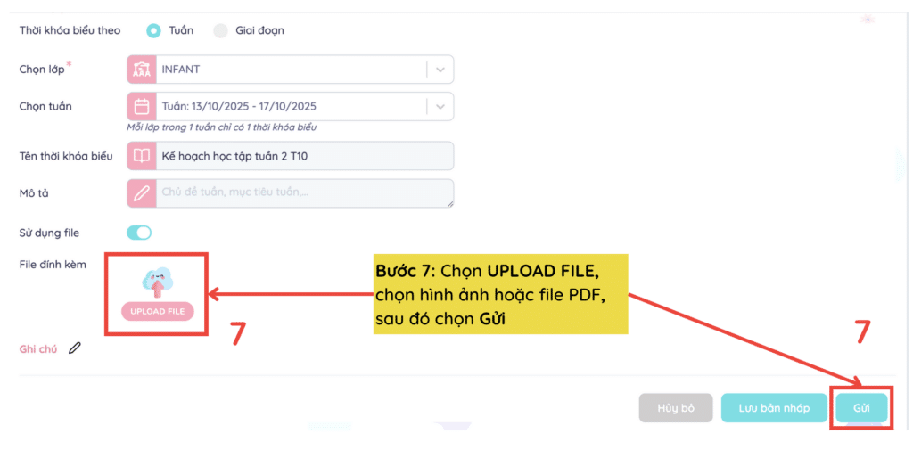 Bước 7: Chọn UPLOAD FILE, chọn hình ảnh hoặc file PDF thời khoá biểu lên, sau đó chọn Gửi