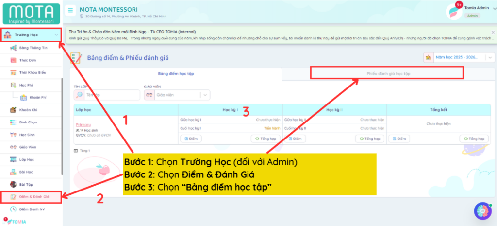 Tính năng Điểm và Đánh giá sẽ được bật/tắt tùy vào nhu cầu sử dụng của nhà trường, vui lòng liên hệ đội ngũ TOMIA để được hỗ trợ cấu hình.