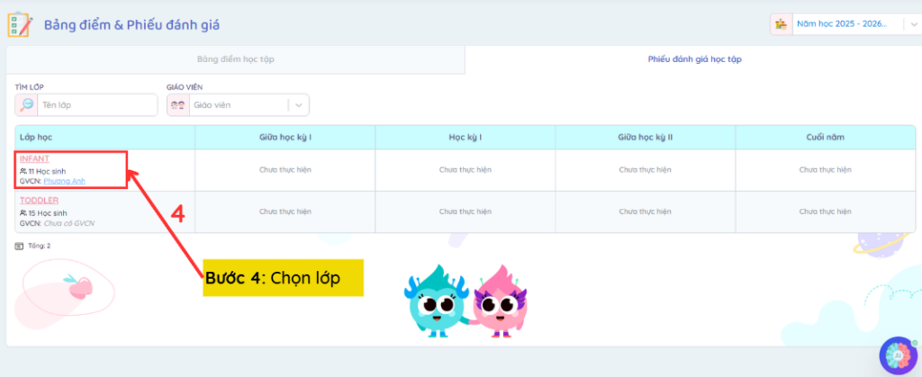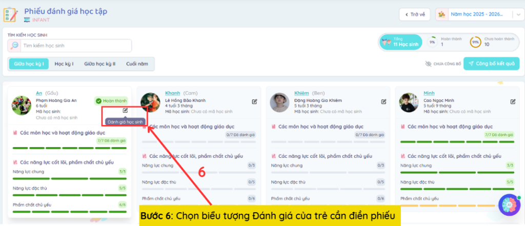 Bước 6: Chọn biểu tượng Đánh giá của trẻ cần điền phiếu