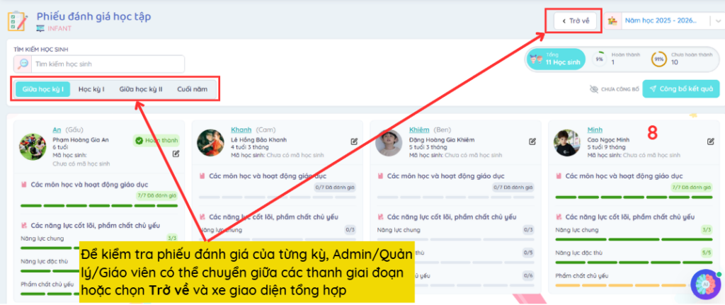 Để kiểm tra phiếu đánh giá của từng kỳ, Admin/Quản lý/Giáo viên có thể chuyển giữa các thanh giai đoạn hoặc chọn Trở về và xe giao diện tổng hợp