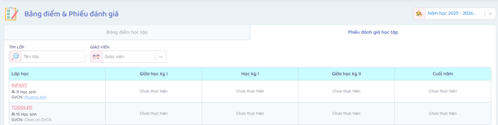 Để nhập hoàn thành phiếu đánh giá học tập cho trẻ/học sinh, Admin và Giáo viên thực hiện các thao tác sau: