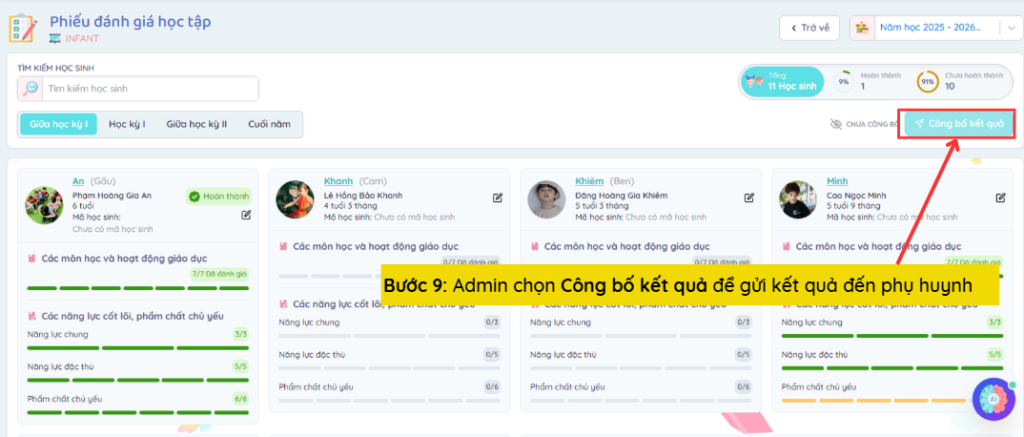 Bước 8: Sau khi hoàn thành đánh giá cho toàn bộ trẻ/học sinh, chọn Công bố kết quả